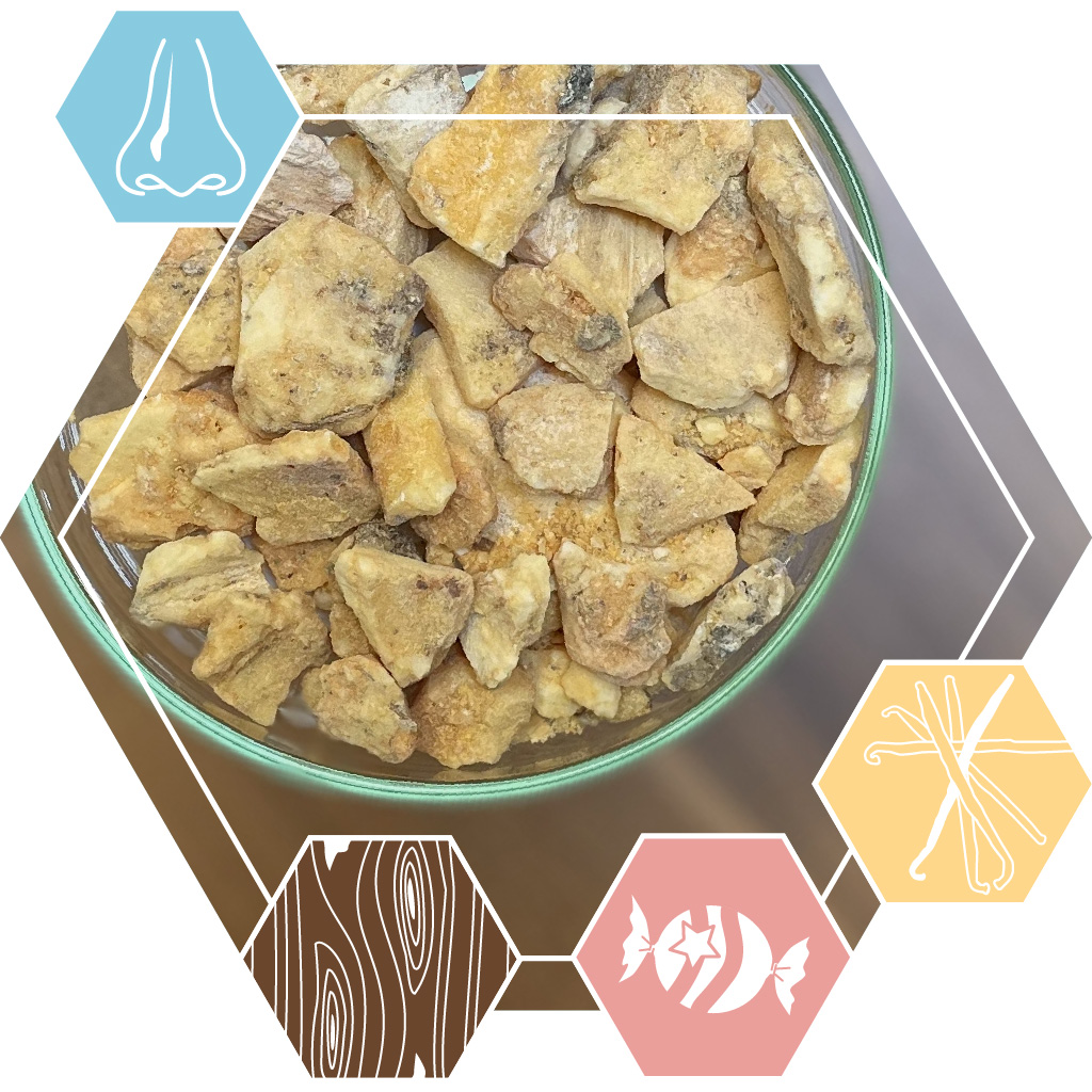 Benzoë Siam hars is bij kamertemperatuur een witgeel tot roodbruine hars. We leveren dit in stukjes van ongelijke grootte: centimeters lang tot fijn poeder. Het is een natuurproduct dat op traditionele manier wordt gewonnen en verzameld. Het kan daardoor tot 10% vervuilingen bevatten zoals zand, hout, maar ook delen van eerder gebruikte verpakkingen. De hars is vrij lang houdbaar.
