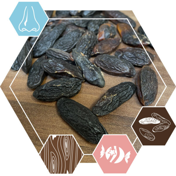 De Hekserij verkoopt géén producten die bedoeld zijn voor gebruik in levensmiddelen of voor ander inwendig gebruik. Dit product is GEEN uitzondering. Overigens is het gebruik van tonkabonen in eten so-wie-so niet aan te raden omdat het coumarine bevat dat bij inwendig gebruik schadelijk kan zijn.